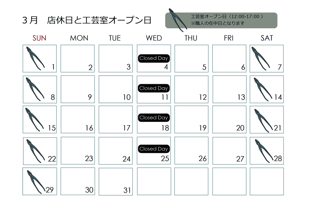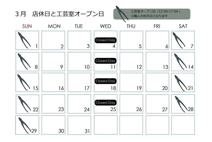 3月・2月の店休日・工芸室に職人が在中している日時をお知らせいたします。